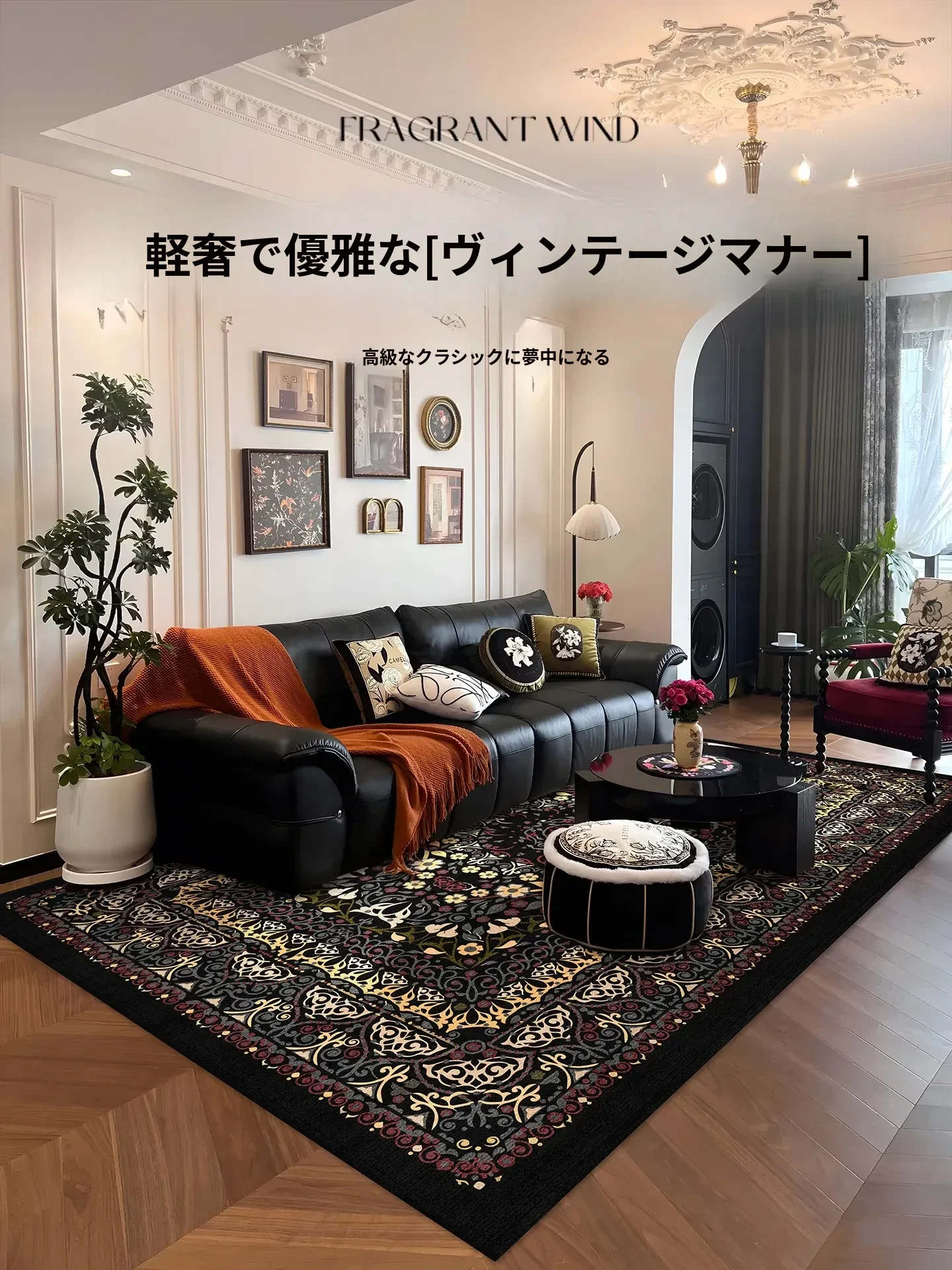 新作!高級フレンチスタイルのリビングラグ、ソファマットとしても最適。お手入れ簡単&防水仕様で、厚手のビンテージデザイン。美しい中華テーブルとも相性抜群!